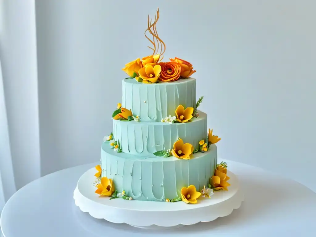 Una obra maestra de repostería con decoraciones elaboradas y delicadas flores de azúcar